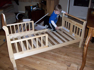 He helped daddy put it together. And also helped daddy take the crib out of his room too. He was excited to be in a big boy bed. As bed time got closer the first night I was a little nervous as to how long he would be in bed and how many times would he get up. Not once. Took it like a pro and stayed in bed all night! We were proud!